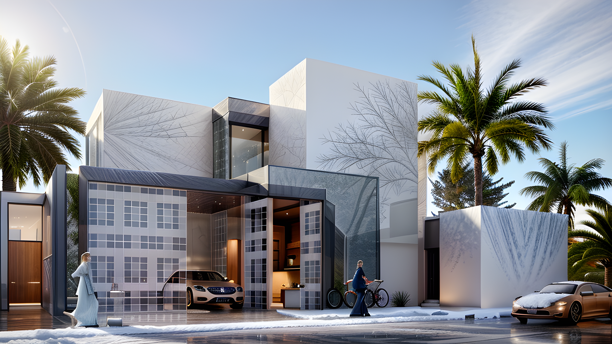 A visionary exploration of eco-conscious minimalism, designed to thrive in arid climates through passive cooling and biophilic integration. The architecture is defined by its stark white cubic volumes, which reflect solar heat, and intricate geometric mashrabiya screens that provide natural ventilation and privacy without sacrificing daylight. By weaving vertical greenery and palm-shaded courtyards into a clean, modular layout, the project demonstrates how luxury and sustainability can coexist—creating a high-performance sanctuary that reduces its environmental footprint while offering a serene, light-filled living experience.
