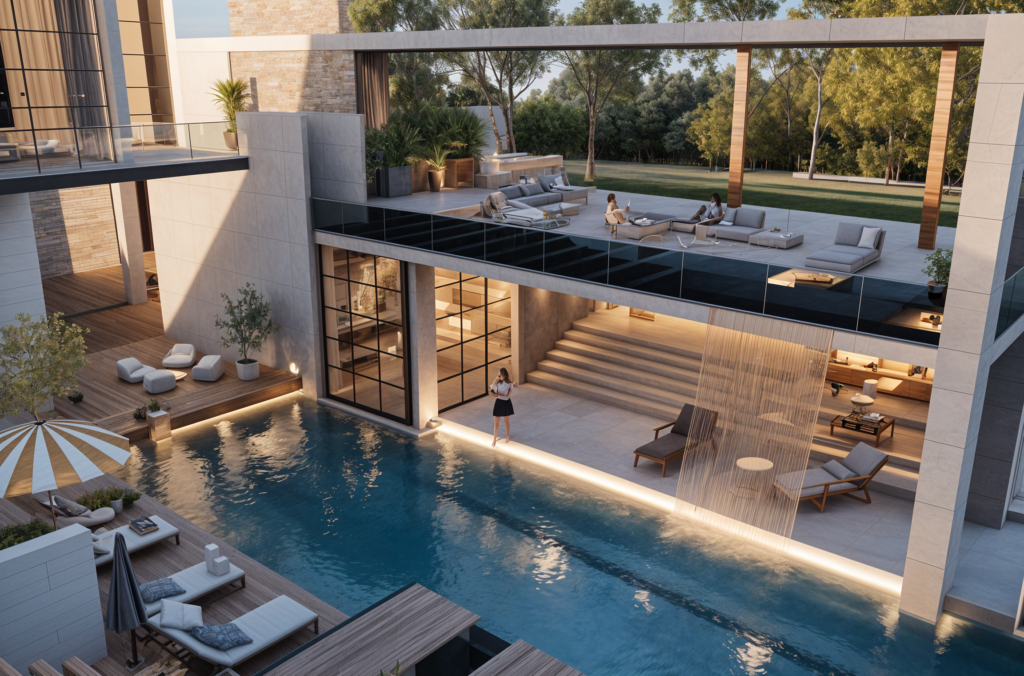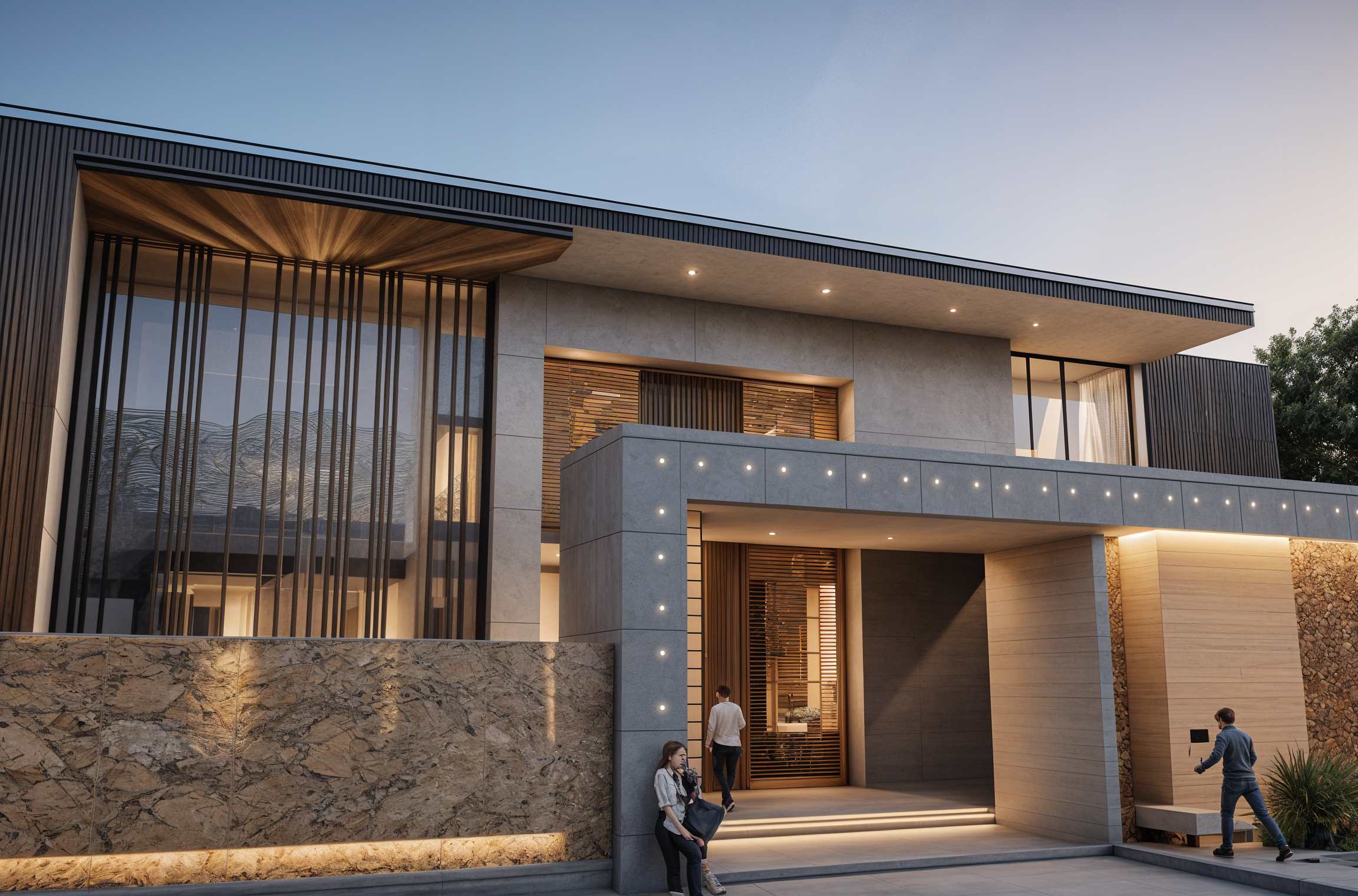 A contemporary villa design that blends modern architecture with refined materiality. The façade features vertical architectural fins and textured concrete surfaces, creating depth, rhythm, and visual elegance. Warm integrated lighting highlights the architectural lines, while large floor-to-ceiling windows enhance transparency and connection between interior and exterior spaces. The covered entrance and carport are carefully proportioned to provide comfort, privacy, and a welcoming arrival experience. This design reflects a balance between functionality, luxury, and timeless modern aesthetics.