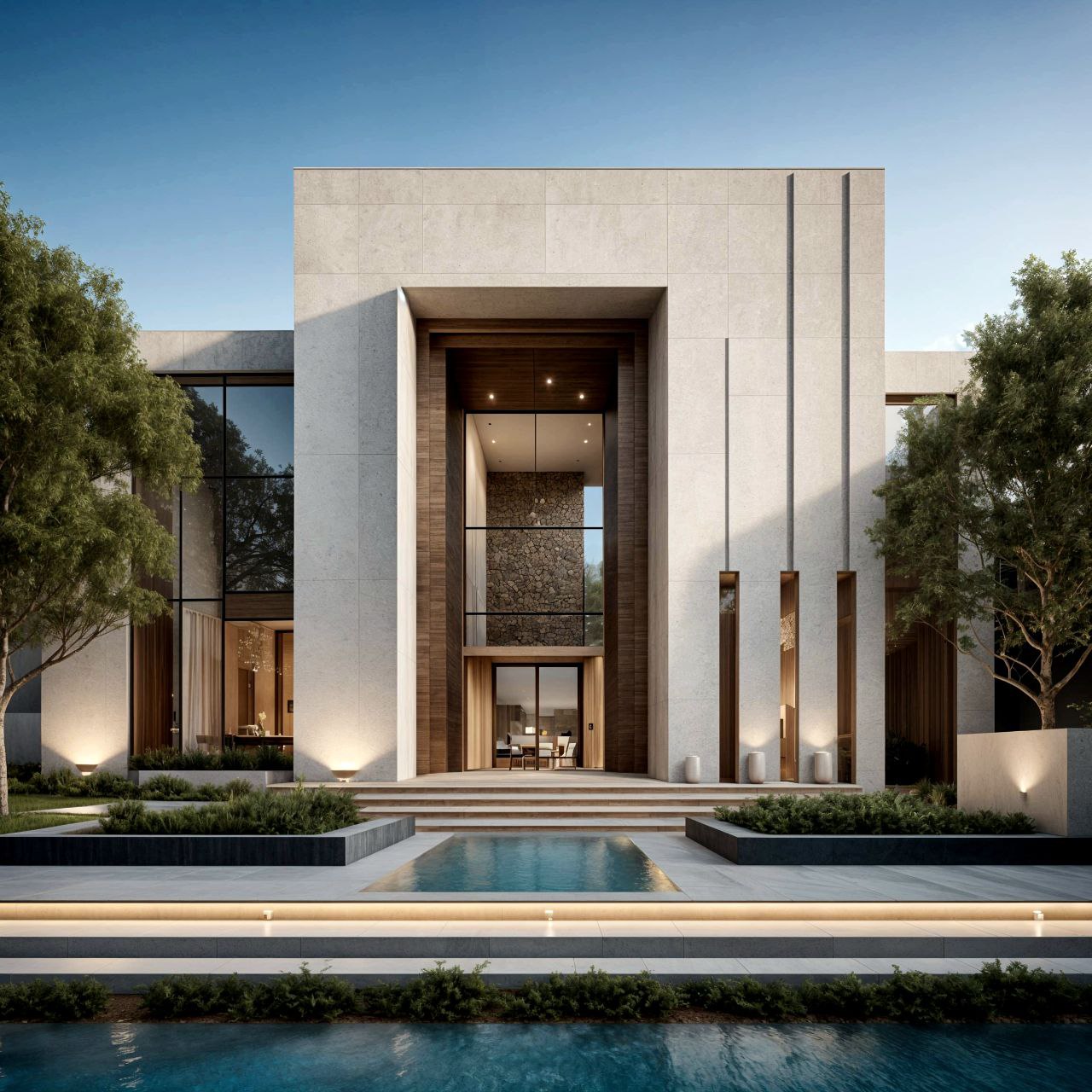 A contemporary villa design that blends modern architecture with refined materiality. The façade features vertical architectural fins and textured concrete surfaces, creating depth, rhythm, and visual elegance. Warm integrated lighting highlights the architectural lines, while large floor-to-ceiling windows enhance transparency and connection between interior and exterior spaces. The covered entrance and carport are carefully proportioned to provide comfort, privacy, and a welcoming arrival experience. This design reflects a balance between functionality, luxury, and timeless modern aesthetics.