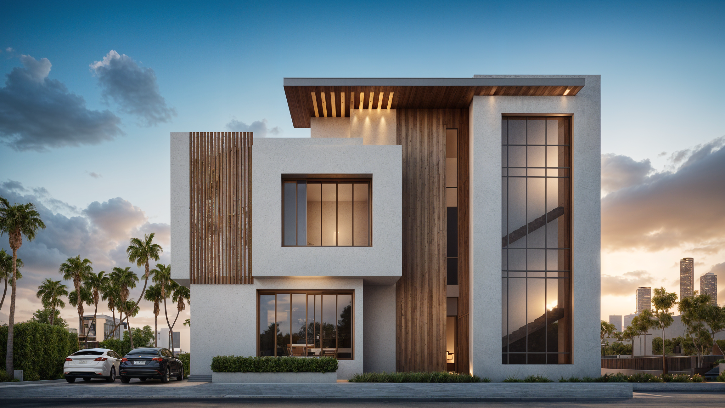 This residence is a bold exploration of verticality and material contrast, anchored by two soaring glass apertures that define the home’s primary circulation and social zones. The architecture is composed of staggered, rough-cast concrete volumes that are artfully bisected by a dramatic, full-height timber-clad recessed entry, creating a warm and monumental threshold. Strategically placed vertical louvers on the upper level provide a rhythmic architectural screen that balances natural light infiltration with residential privacy, while a deep-set cantilevered roof plane offers a sharp, modern silhouette against the skyline. By integrating expansive floor-to-ceiling glazing with grounded, monolithic masonry, the project delivers a highly sculptural living environment that celebrates structural clarity and a sophisticated, organic material palette.
