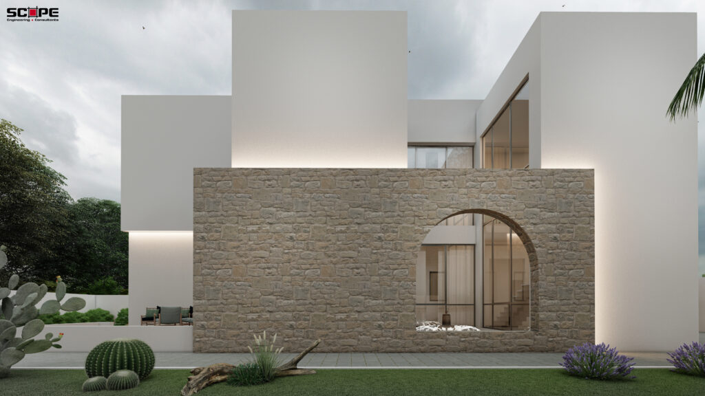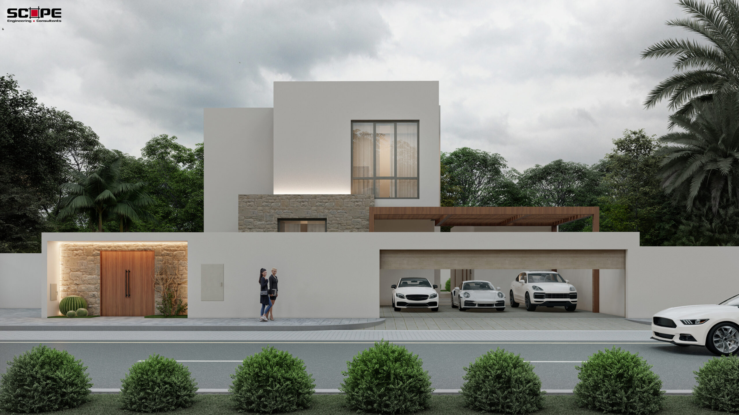 This residence is a study in clean-lined minimalism, characterized by a series of interlocking white monolithic volumes that are thoughtfully grounded by a rough-hewn stone masonry feature wall. The facade is defined by its horizontal emphasis, featuring a wide, open-bay carport and a primary entrance threshold distinguished by a warm timber door set within a natural stone alcove. A prominent upper-level window aperture provides a focal point of transparency against the solid massing, while a thin-profile timber pergola offers delicate architectural shading. By balancing expansive, smooth plaster surfaces with these tactile, organic textures, the project creates a sophisticated and serene street presence that exemplifies modern luxury through restrained geometry and material honesty.