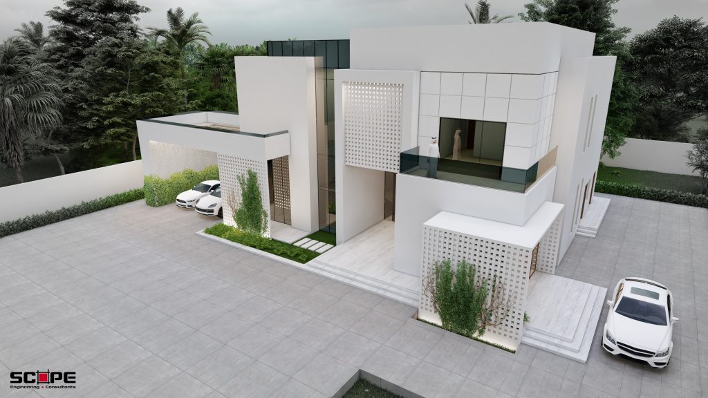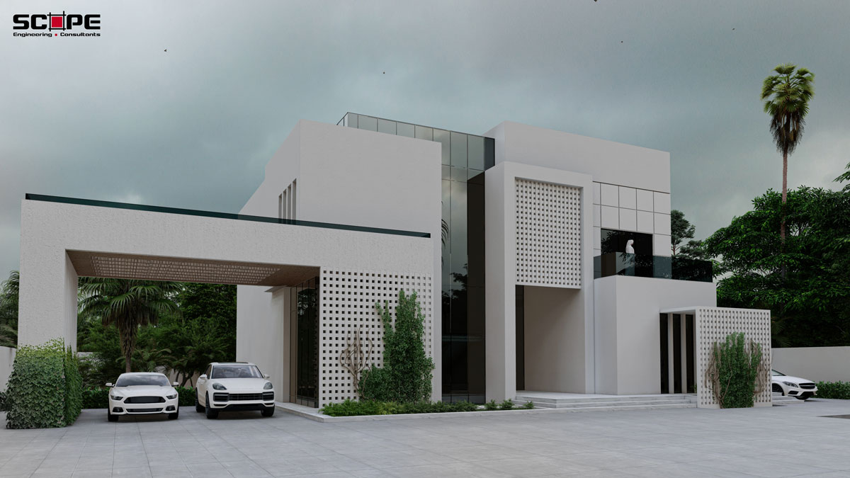 A sophisticated residential project that harmonizes high-performance eco-design with a clean, modular aesthetic. Characterized by its brilliant white cubic volumes, the architecture is specifically engineered to reflect intense solar heat, while intricate geometric screen walls—a modern interpretation of traditional mashrabiya—facilitate natural cross-ventilation and provide sophisticated privacy. By integrating lush vertical greenery and shaded courtyards into its crisp, minimalist silhouette, the project demonstrates how luxury living can be sustainably adapted for arid climates, creating a light-filled, energy-efficient sanctuary that remains deeply connected to its environment.