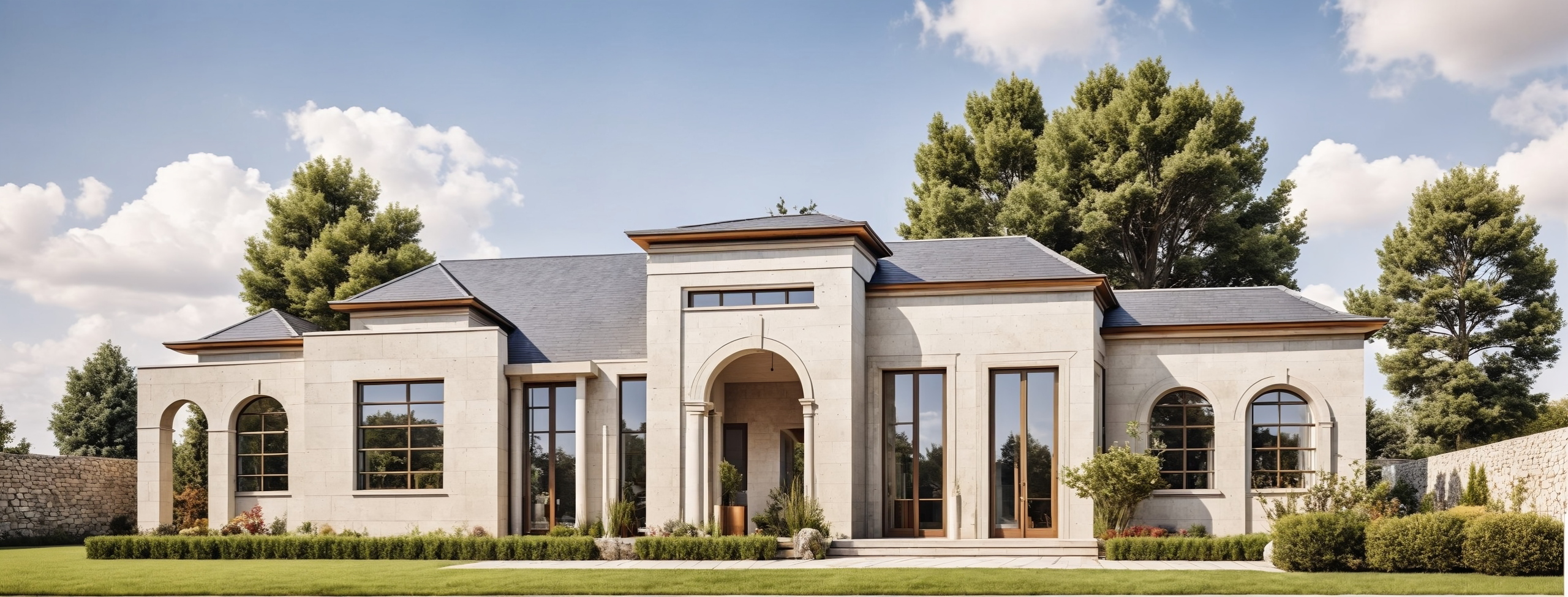 A masterclass in neo-classical elegance, seamlessly blending the monumental scale of a European manor with the serenity of modern living. Defined by its symmetrical limestone facade and rhythmic arched porticos, the residence utilizes a timeless palette of sand-toned masonry and dark slate to create a sense of permanent luxury. Expansive floor-to-ceiling windows and refined bronze fenestration invite an abundance of natural light into the interior, while the integrated landscape design ensures the home remains a private, sophisticated sanctuary.