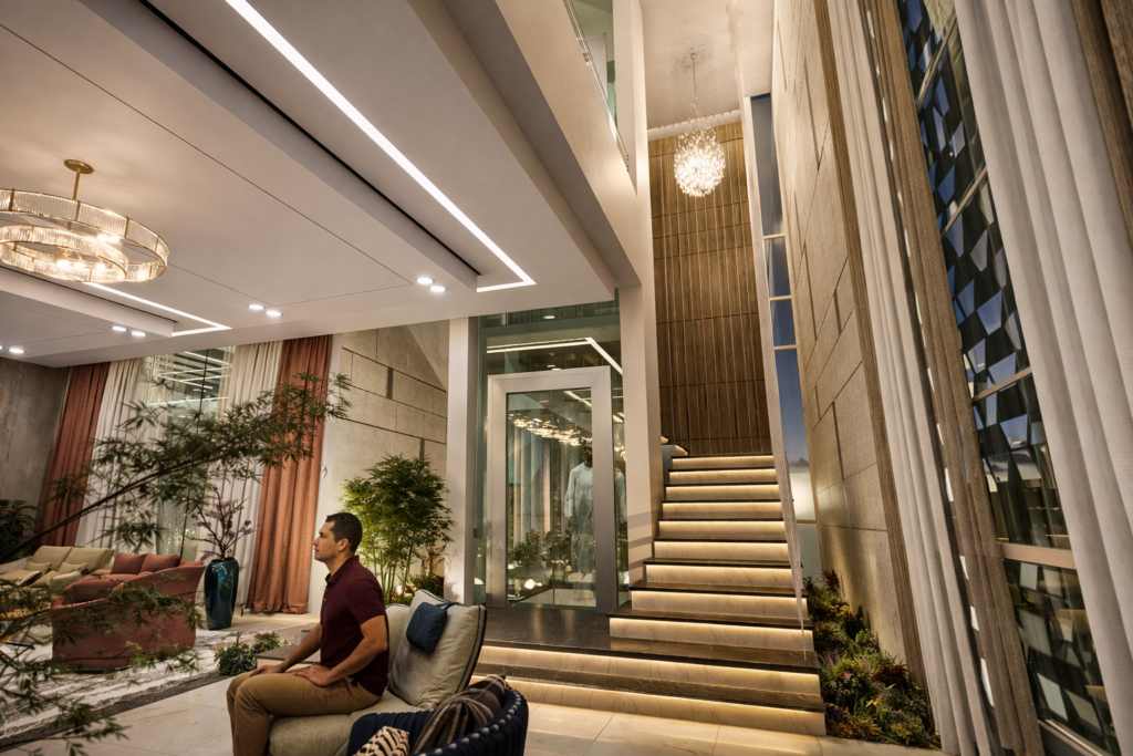 Inside, a dramatic statement staircase with integrated ambient lighting shapes the arrival experience and adds a refined architectural focal point. Warm textures, natural tones, and carefully selected lighting complete the mood—modern, luxurious, and welcoming.