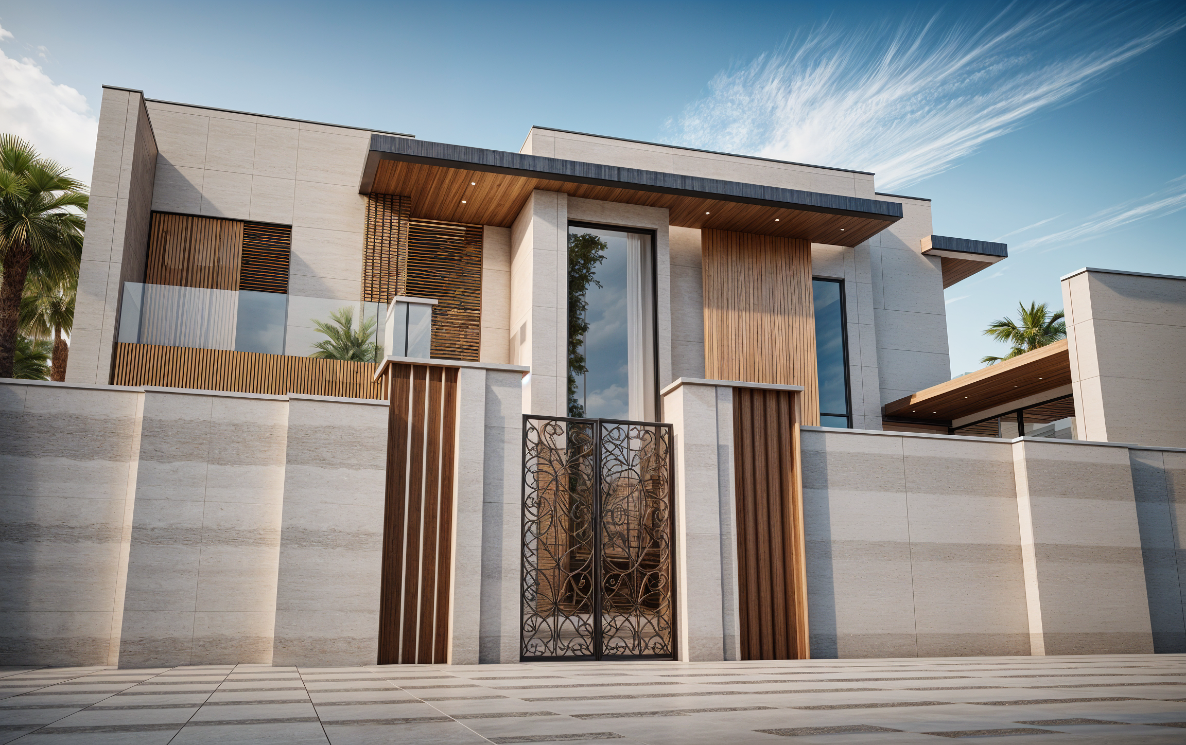 A contemporary luxury villa characterized by strong architectural symmetry and a refined minimalist aesthetic. The design features a dramatic double-height entrance framed with natural stone and warm wood finishes, creating a powerful sense of arrival. Large floor-to-ceiling glazing enhances transparency and allows natural light to flow seamlessly into the interior spaces, strengthening the connection between indoor and outdoor living.